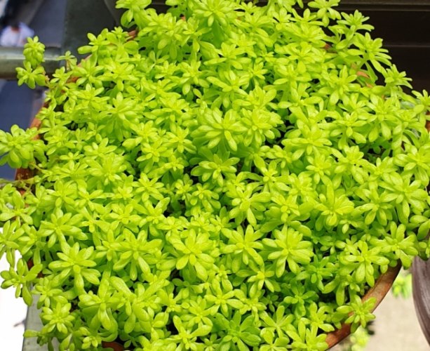 • 迷你黃金萬年草:這個超可愛!葉片極度細小緊密,像超迷你的星星聚在一起。匍匐性更好,鋪出來的地毯效果更細緻。但相對的,它對環境變化更敏感一點,夏天太熱或冬天太冷都容易... 縮給你看(我的慘痛經驗)。比較適合有經驗的肉友或小品盆栽。