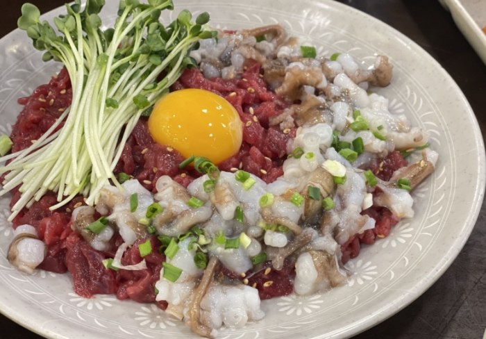介紹: 敢吃生食的朋友,這攤絕對要放進口袋名單!招牌就是 「生牛肉+生章魚」的雙拼 (육회+산낙지)。生牛肉切絲拌上芝麻油、梨絲、蛋黃,口感滑順鮮甜,完全沒有腥味。生章魚則是剪成小段還在蠕動,沾上香油和芝麻,放入嘴裡那奇妙的吸吮感很特別 (別怕,咬快點就對了!)。醬料是靈魂,甜甜鹹鹹帶點芝麻香,完美襯託食材鮮味。個人覺得比單純的生章魚攤更值得吃!